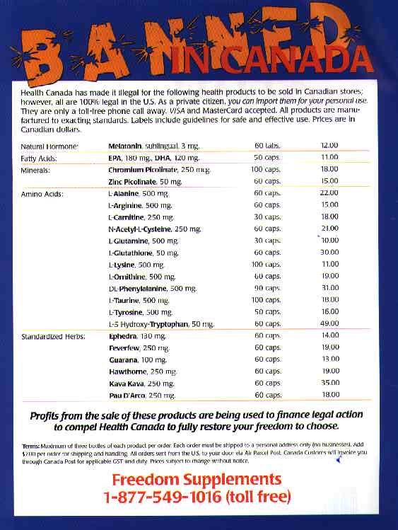 Health Canada has made it illegal for the following products to be sold in Canadian stores; however, all are 100% legal in the U.S. As a private citizen, you can import them for your personal use. They are only a toll-free phone call away. VISA and MasterCard accepted. All products are manufactured to exacting standards. Labels include guidelines for safe and effective use. Prices are in Canadian dollars.:
